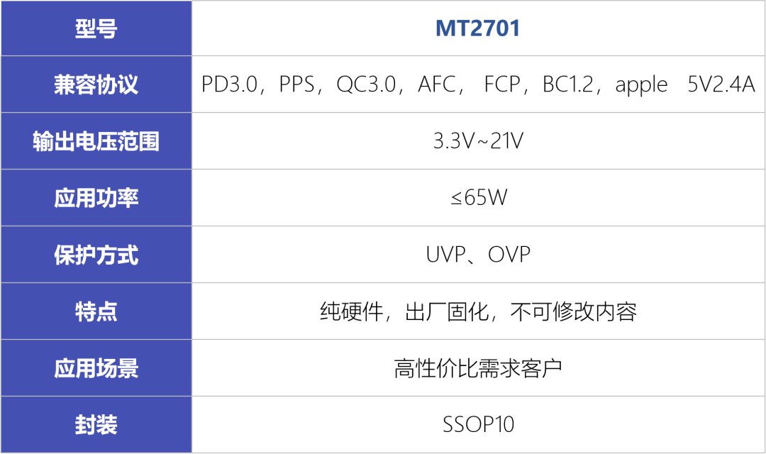 美芯晟開發(fā)的快充協(xié)議芯片包括MT2701和最新的MT280X系列,芯片兼容多種快充協(xié)議。MT2701支持65W以內(nèi)應(yīng)用,兼容PD3.0,PPS,QC2,QC3,AFC,F(xiàn)CP,私有協(xié)議低壓直充5V4.5A,Apple 5V2.4A,BC1.2等常用協(xié)議。MT2701采用純硬件架構(gòu),通過外部元件來調(diào)節(jié)輸出功率段,應(yīng)用簡單,BOM成本低,適合不需要USB-IF認(rèn)證的客戶。