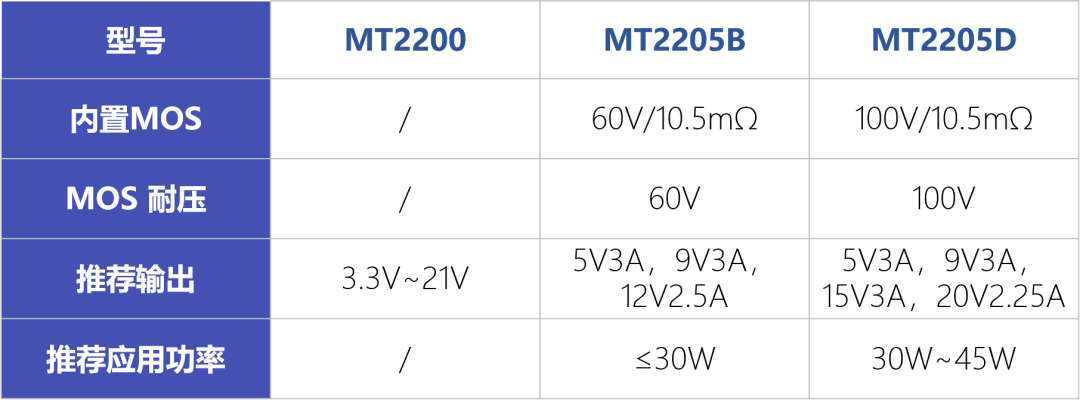 MT2200可輸出3.3V~21V,滿足USB PPS寬電壓輸出要求。MT2205內(nèi)置Si MOS,利于小型化設(shè)計。
