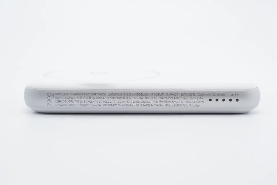 摩米士這款磁吸充電寶IP103MFI在內置7200mAh容量電芯的情況下仍擁有比較小巧的機身,續(xù)航能力強同時磁吸充電時不會擋住攝像頭,支持邊充邊用。此外配有USB-C和Lightning口,支持20W有線快充,對于iPhone用戶來說帶線方面就變得十分簡便。產品還通過了蘋果MFi認證,質量有保證。
