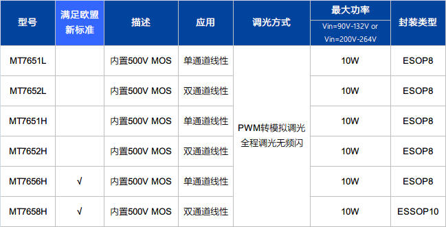 美芯晟科技從市場出發(fā),研發(fā)出新一代低成本高性能無頻閃線性PWM智能調(diào)光方案—MT7651L/H和MT7652L/H。同時(shí)針對歐盟2021年9月1日開始執(zhí)行的ERP能效新標(biāo)準(zhǔn),美芯晟也率先推出滿足歐盟新標(biāo)準(zhǔn)線性PWM智能調(diào)光產(chǎn)品—MT7656H和MT7658H。
