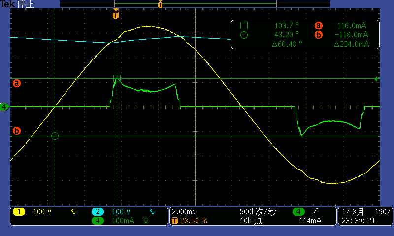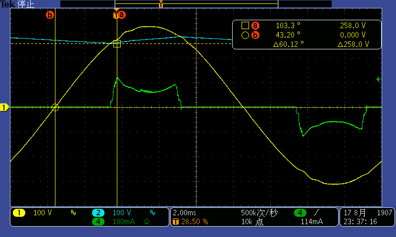 CH1黃:Vin,CH2蘭:Vcap ,CH4綠:Iin  230Vac
