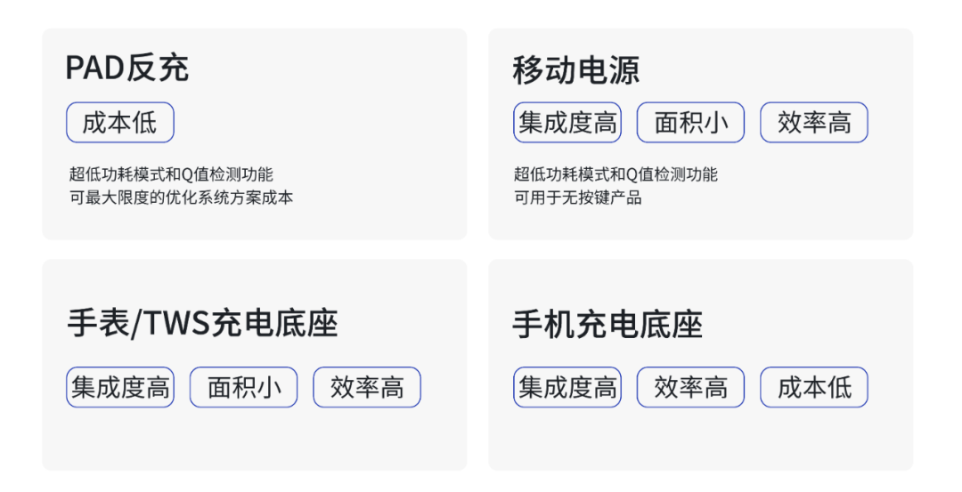 美芯晟在無線充電領(lǐng)域深耕數(shù)年,擁有全面覆蓋無線快充電源管理芯片的完整產(chǎn)業(yè)鏈核心技術(shù),關(guān)鍵性能指標(biāo)達到國際先進水平,產(chǎn)品豐富度在業(yè)內(nèi)領(lǐng)先,可滿足中小功率、大功率、車規(guī)級等不同的終端產(chǎn)品應(yīng)用需求。