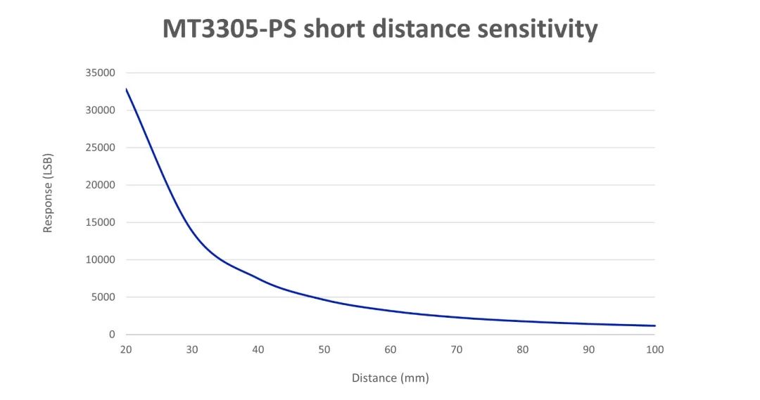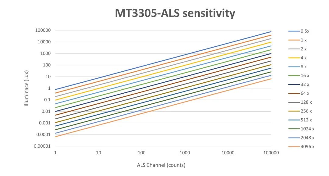 增益范圍越寬,靈敏度越高。MT3305可以實(shí)現(xiàn)0.5x~4096x的超寬增益范圍,不僅可以大大增強(qiáng)設(shè)備在暗光下的檢測能力,對強(qiáng)光環(huán)境同樣具備很好的適應(yīng)性。其環(huán)境光檢測靈敏度可達(dá)到<0.0005 Lux/LSB,接近檢測的距離可達(dá)到40cm以上。