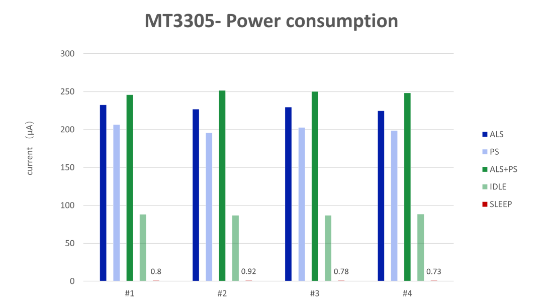MT3305-SCR&SNR實(shí)驗室數(shù)據(jù)對于高性能的傳感器芯片,低功耗是非常關(guān)鍵的參數(shù)指標(biāo)。在提供同等電能的條件下,芯片的待機(jī)功耗低至0.7μA,工作功耗最大保持在260μA以內(nèi),這意味著芯片在運(yùn)行過程中可以增強(qiáng)系統(tǒng)的待機(jī)時長,大大降低發(fā)熱量,帶給設(shè)備更好的使用性能。