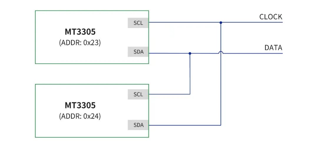 MT3305支持SCL、SDA正反接切換器件地址,可以在一條總線上實(shí)現(xiàn)雙芯片同時使用,這樣可以在節(jié)約總線資源的前提下,實(shí)現(xiàn)多維度的距離感知、全方位的環(huán)境光強(qiáng)感應(yīng),幫助客戶實(shí)現(xiàn)更精準(zhǔn)、更智能的產(chǎn)品應(yīng)用。