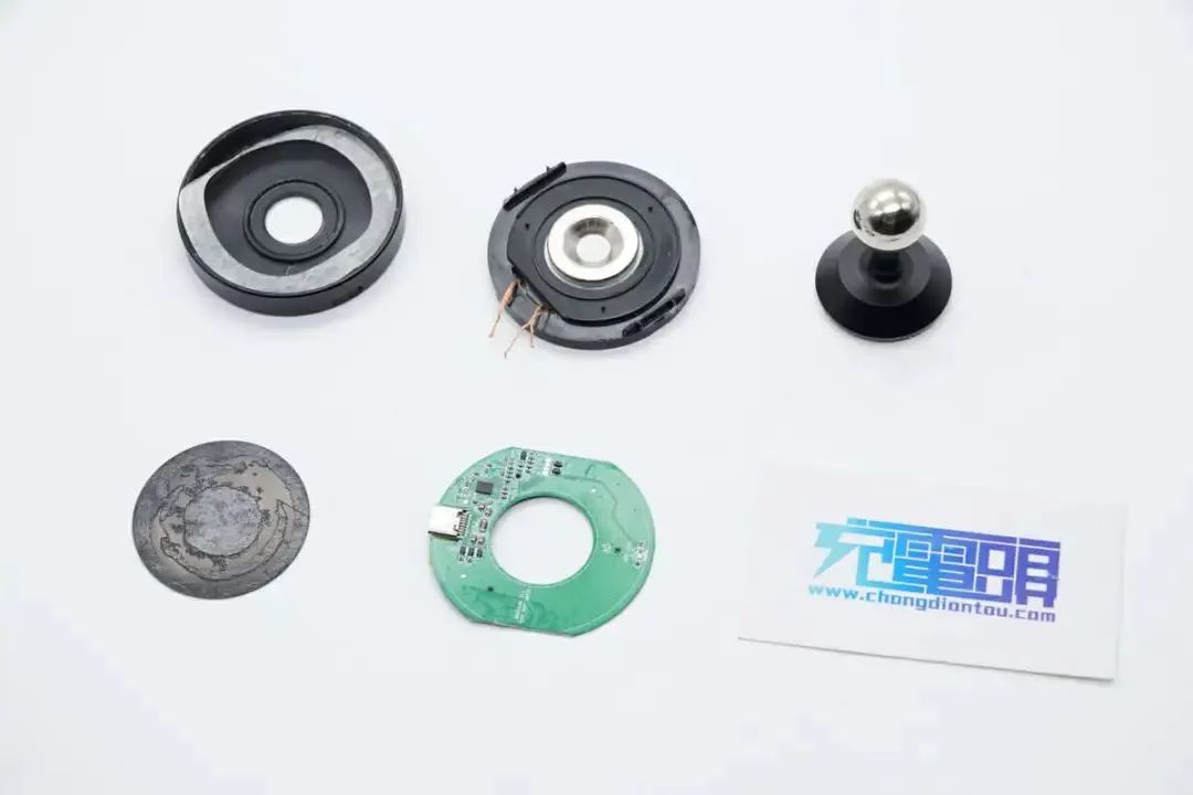 This magnetic wireless charger is composed of two parts: a pillar with a spherical top and a disc-shaped wireless charging board. After magnetic attraction, the charger board supports all rotation angle, making it convenient for users. The pillar base is equipped with a USB-C interface. The diameter of the charging board is 60.02mm, and thickness is 9.73mm.